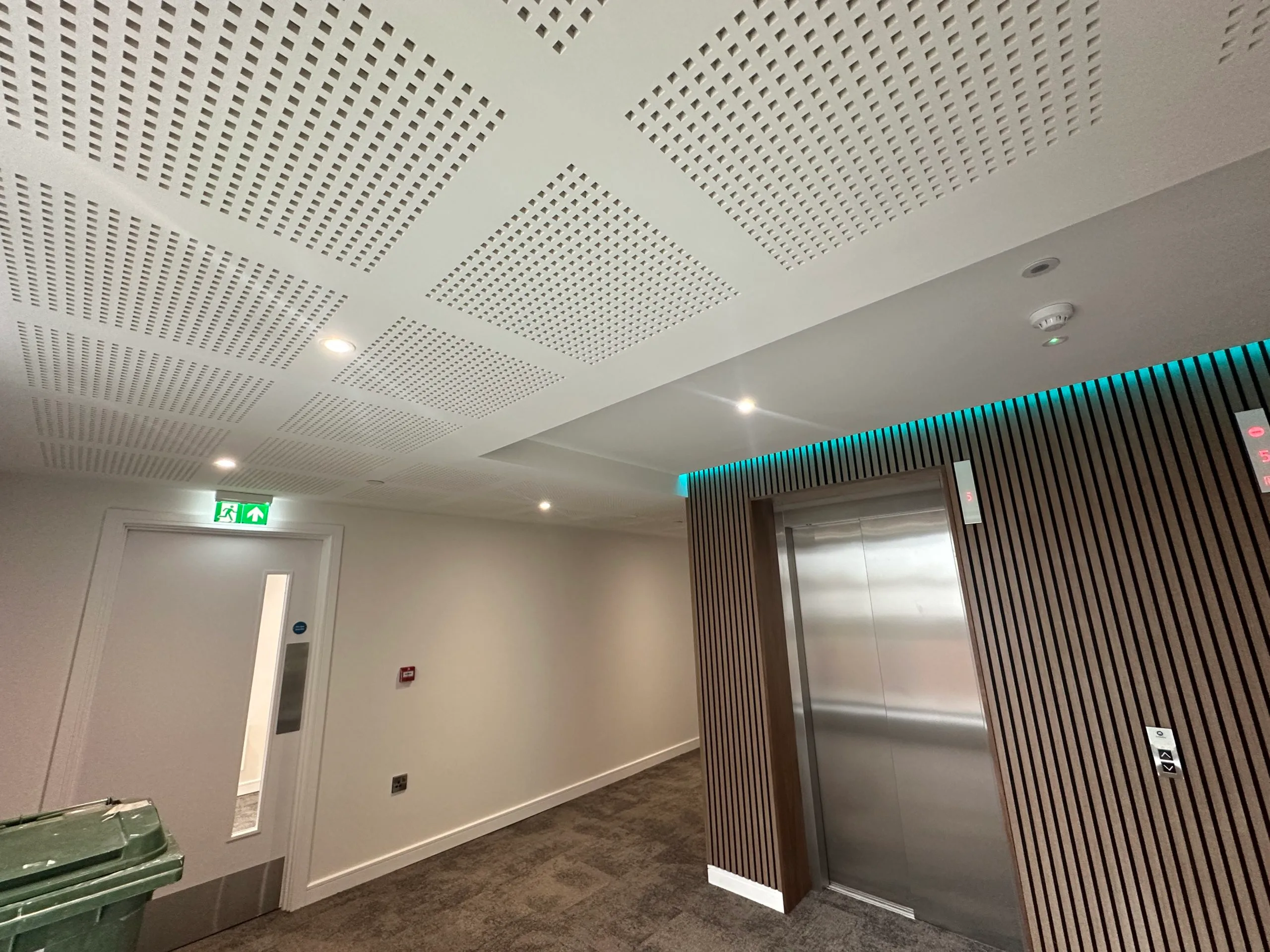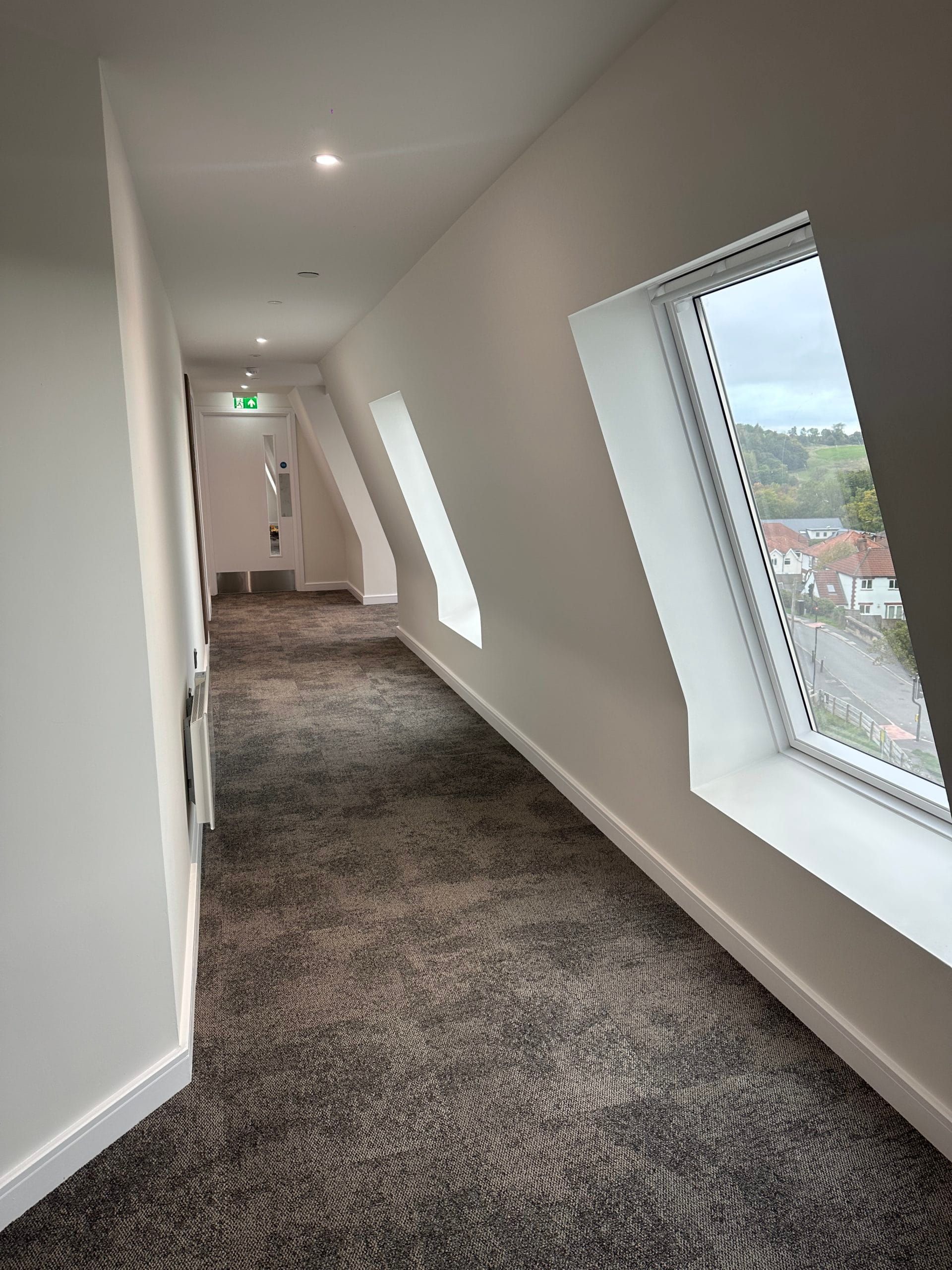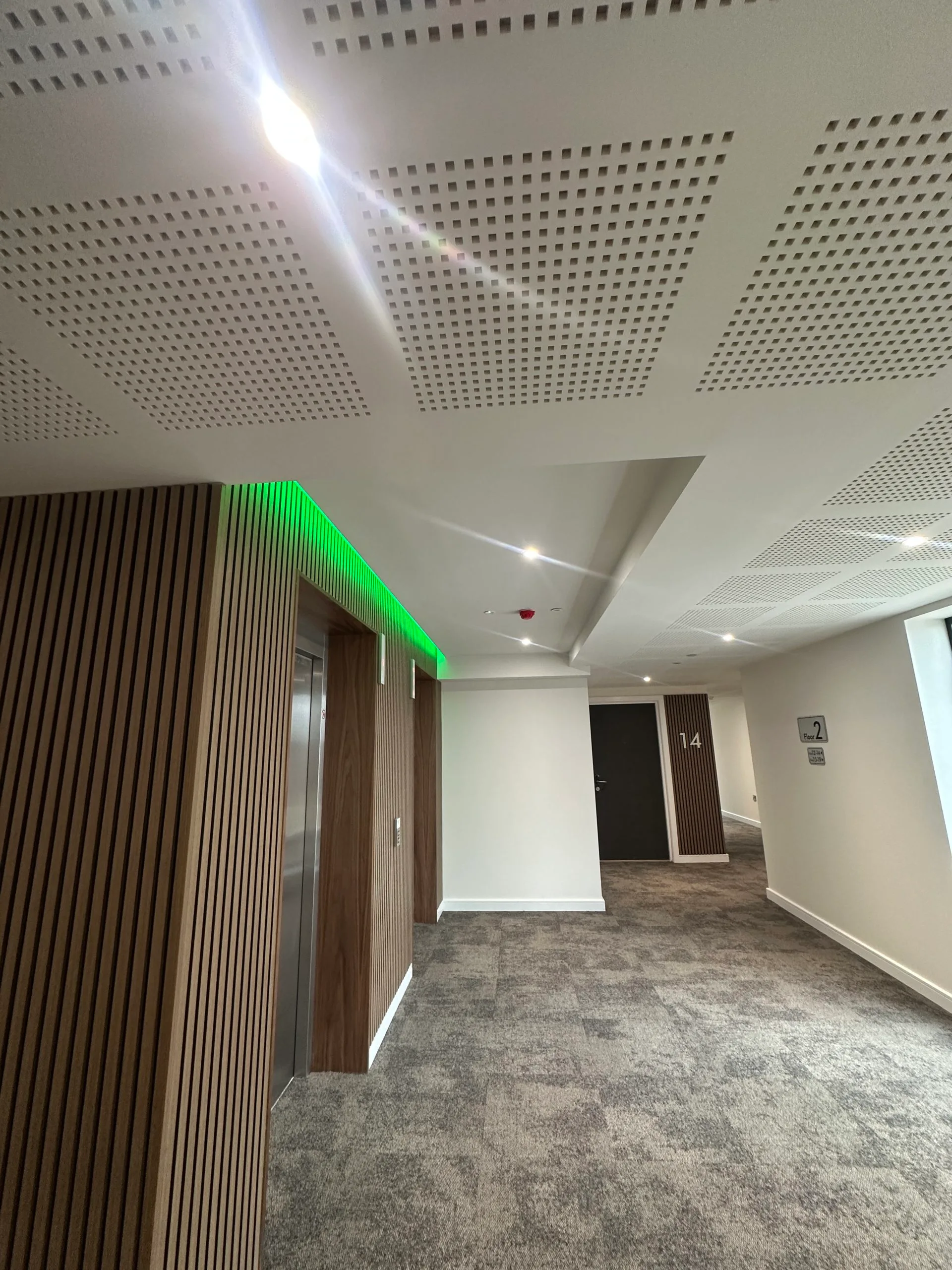 Our Client Artium, and subsequently Sparta, were drafted in to complete the project which had been previously constructed to a shell by another contractor. We collaborated closely with our Client, the Architect and Building Control to overcome legacy issues, completing the SFS through-wall system and installing the internal drylining and plastering works. British Gypsum Quattro acoustic ceilings were installed throughout the communal areas.