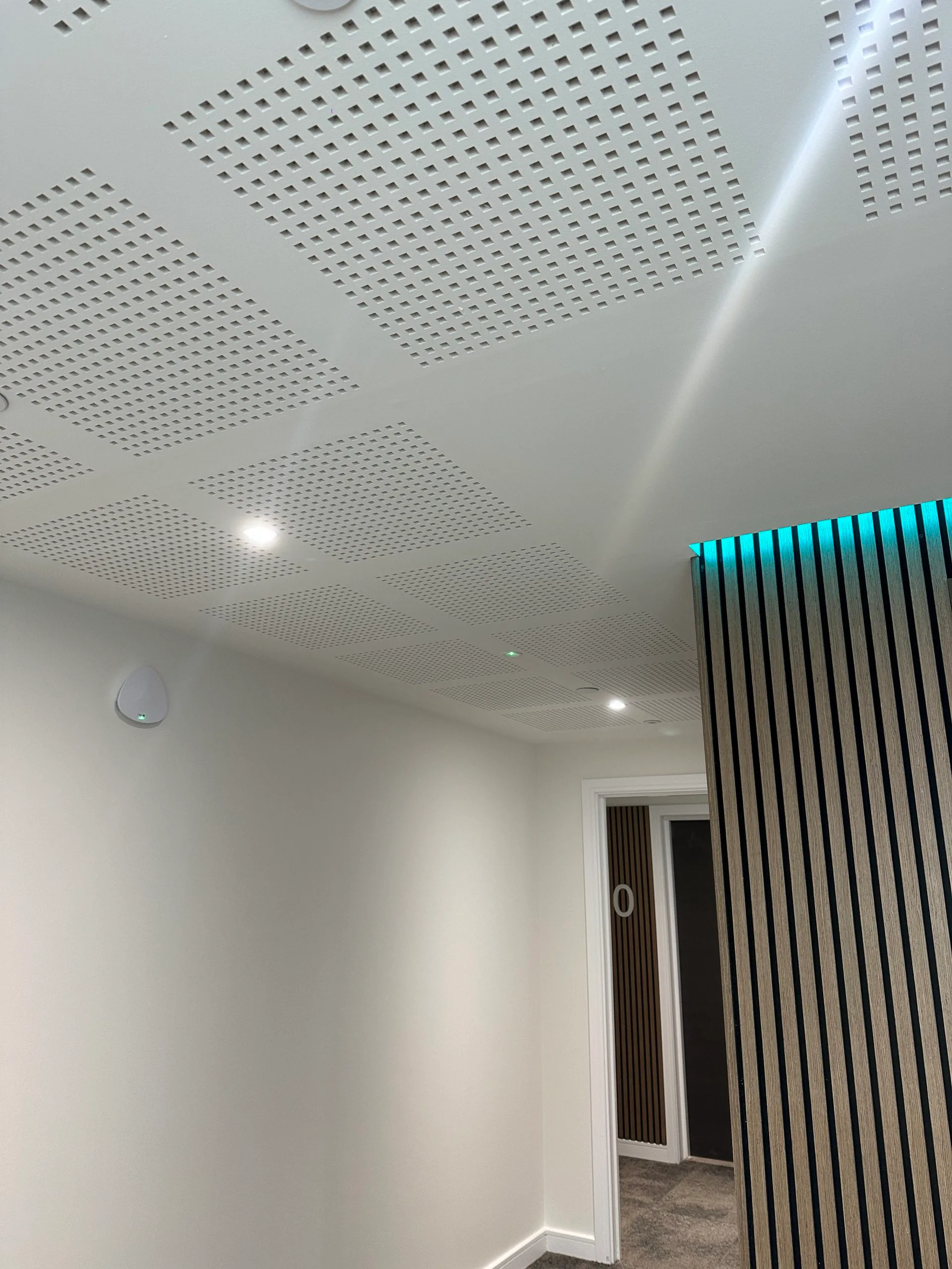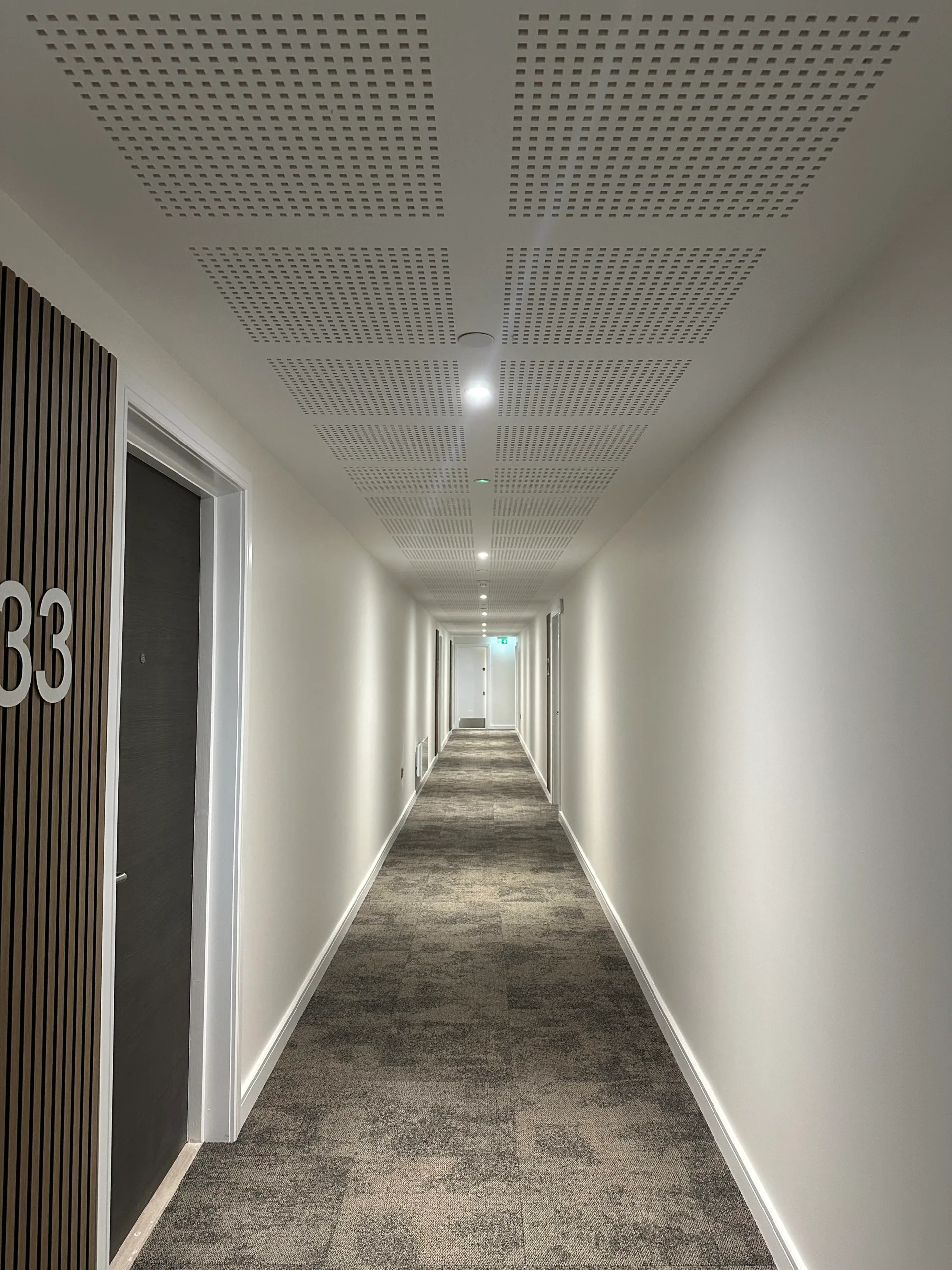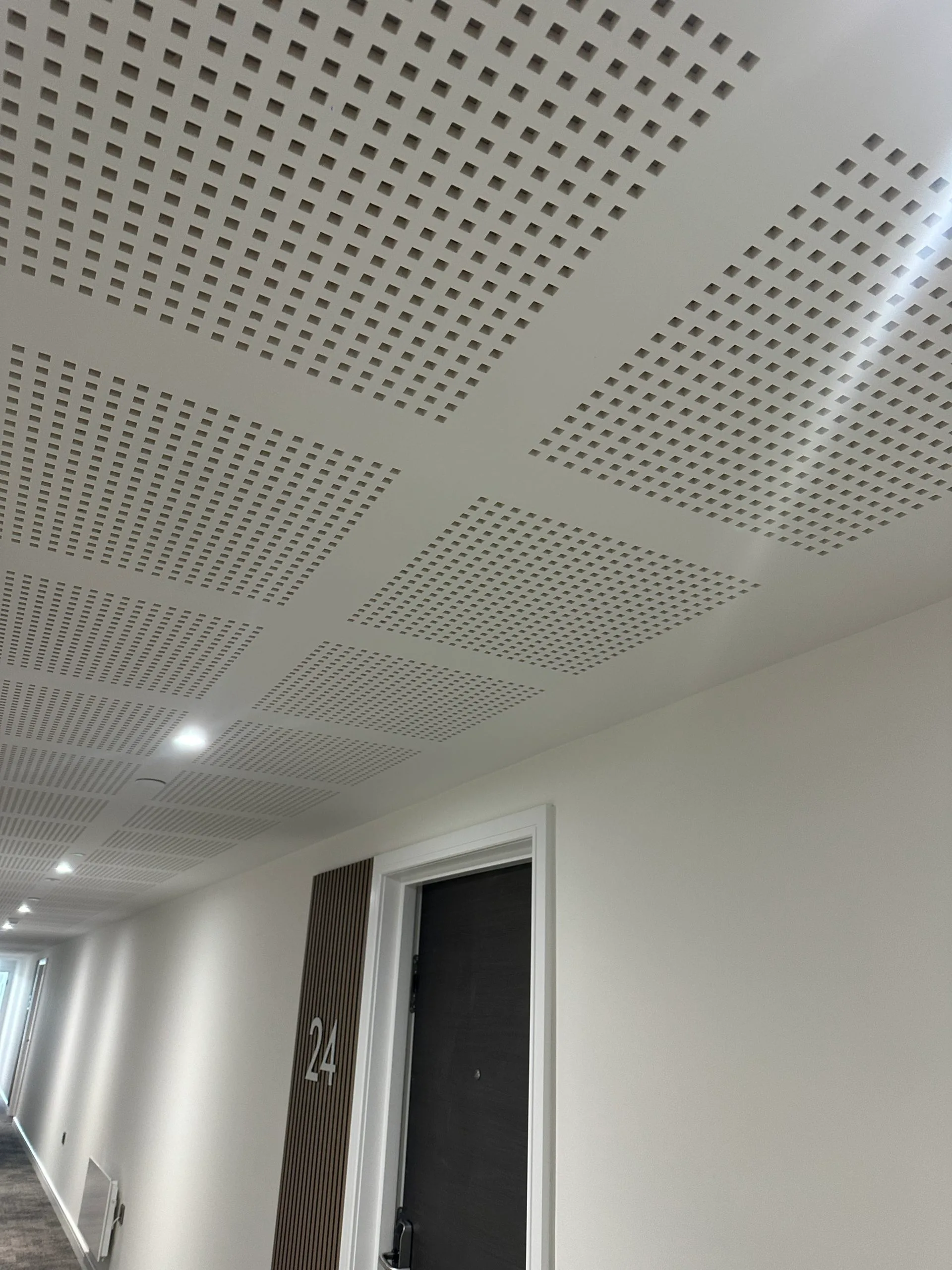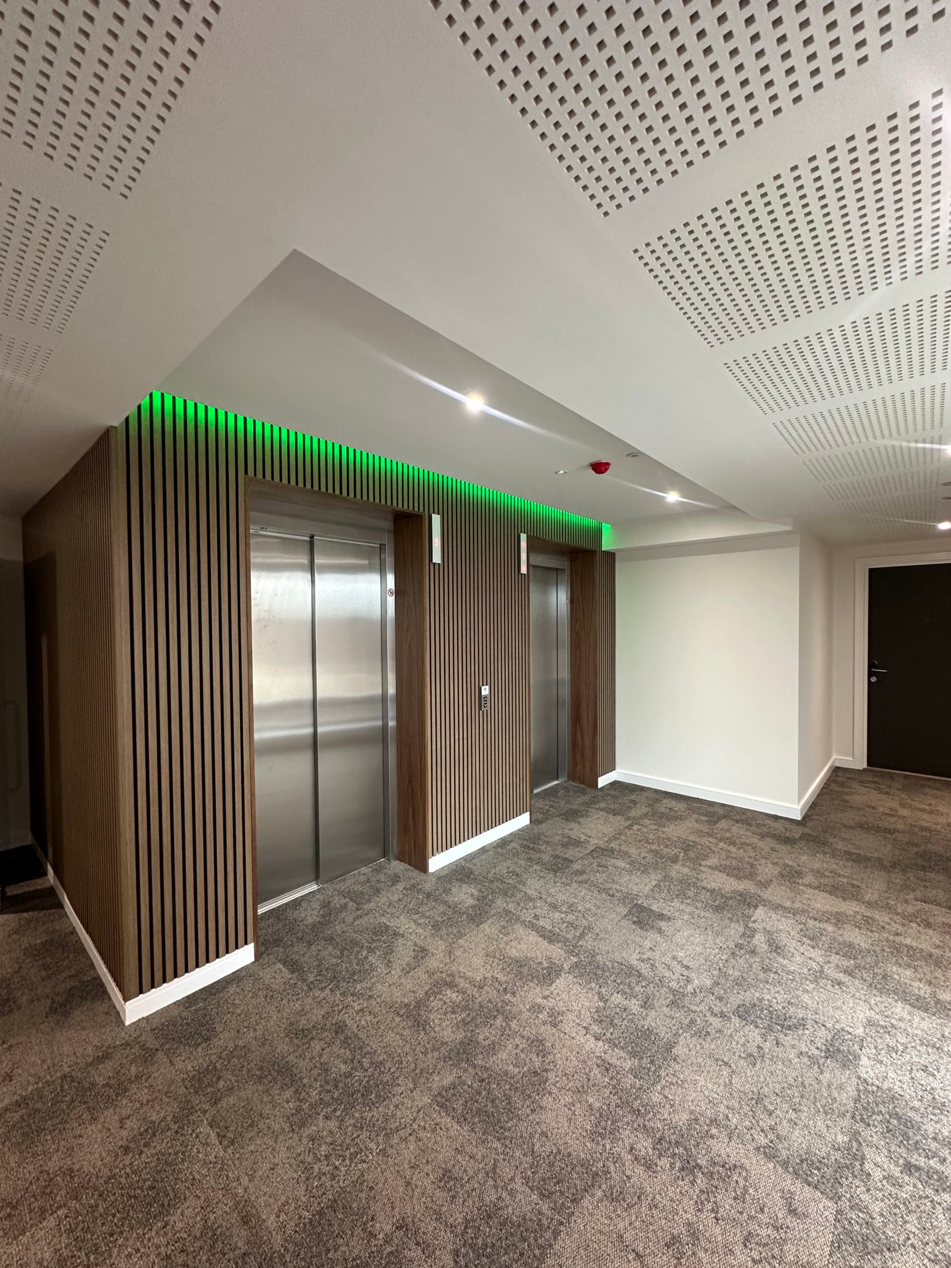 Our Client Artium, and subsequently Sparta, were drafted in to complete the project which had been previously constructed to a shell by another contractor. We collaborated closely with our Client, the Architect and Building Control to overcome legacy issues, completing the SFS through-wall system and installing the internal drylining and plastering works. British Gypsum Quattro acoustic ceilings were installed throughout the communal areas.